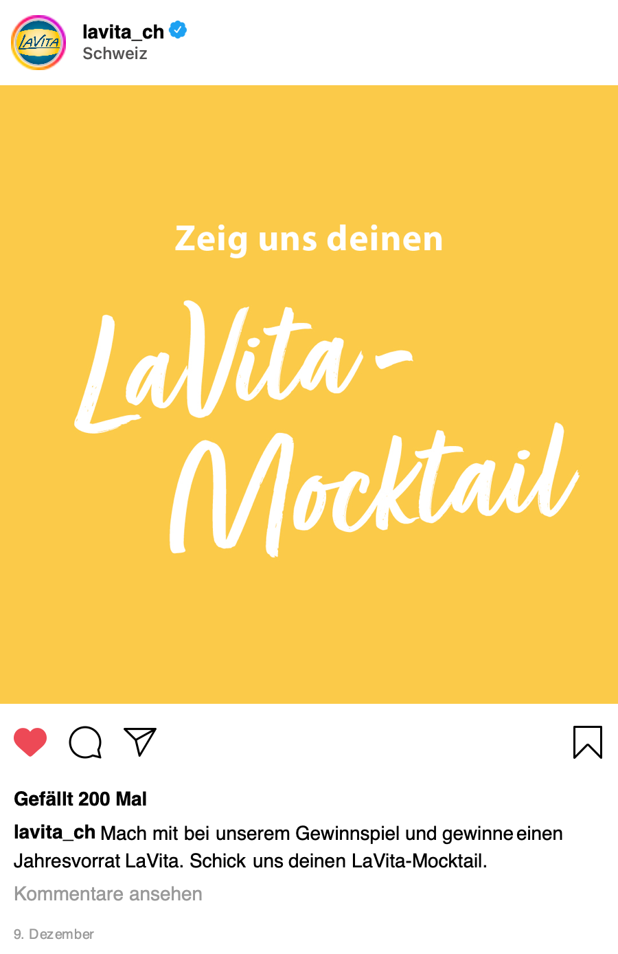 In einem Post wird die Community dazu ermutigt, selbst kreative Drinks mit LaVita zu mixen und uns zuzuschicken. Das bringt Schwung, Zusammenhalt und Spass in die Community, kombiniert mit dem schönen Gefühl etwas gutes für die Gesundheit zu tun. Von den eingesendeten Rezepten wird am Schluss ein Gewinner gewählt.