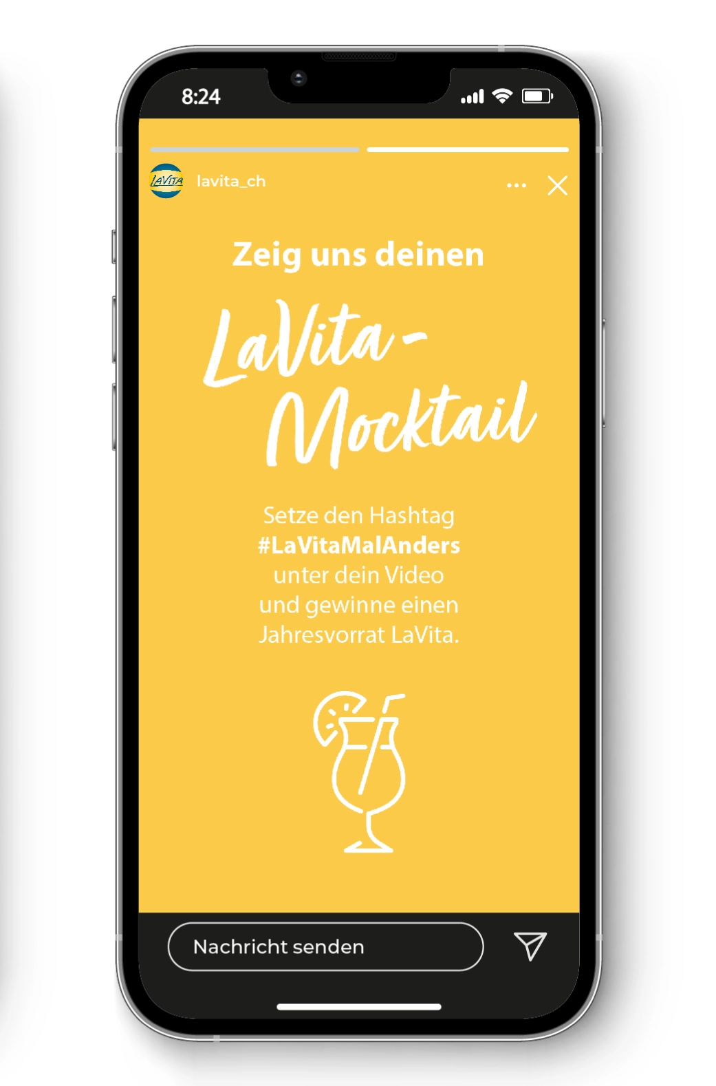 Unsere LaVita-Mocktail Kampagne gestaltet sich als Gewinnspiel auf Social Media. Die Community wird angeregt, mit dem #LaVitaMalAnders, Content mit einer eigenen LaVita-Mocktail Rezeptidee zu posten. Teilnehmende des Gewinnspiels haben die Chance eine Jahresration an LaVita zu gewinnen. Die Kampagne soll sowohl das Community-Engagement erhöhen, mehr Interaktion und Reichweite generieren, als auch die Markenbekanntheit in der Schweiz steigern. Die Zielgruppenerweiterung auf junge Erwachsene und der Aufbau einer Community gelten als Nebenziele.