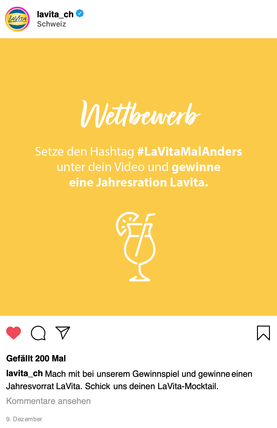 In einem Post wird die Community dazu ermutigt, selbst kreative Drinks mit LaVita zu mixen und uns zuzuschicken. Das bringt Schwung, Zusammenhalt und Spass in die Community, kombiniert mit dem schönen Gefühl etwas gutes für die Gesundheit zu tun. Von den eingesendeten Rezepten wird am Schluss ein Gewinner gewählt.